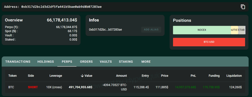 According to Hyperliquid block explorer Hypurrscan, the whale’s BTC position is valued at $496 million with 10x leverage. The trade was opened at $111,831 per Bitcoin, with a liquidation price of $124,270. The position initially started at $163 million and was later increased by more than double.