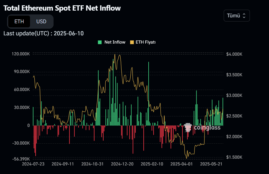 On June 10 alone, a net inflow of $125 million was recorded. The largest contribution came from BlackRock’s ETHA ETF with $80.59 million. These purchases clearly indicate steady demand on the Ethereum ETF front. Although ETF investments currently have limited impact on Ether’s price, on-chain data suggests potential price pressure as most of these investments involve direct spot purchases. Additionally, there has been no net outflow during this entire period.