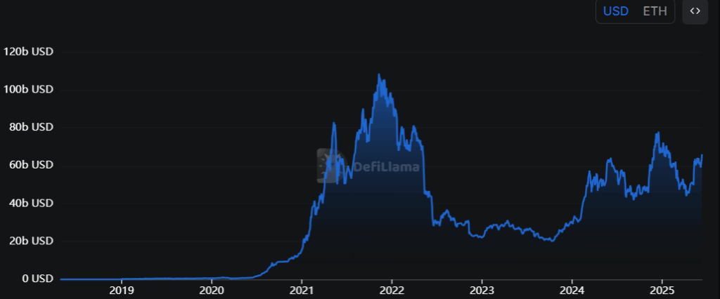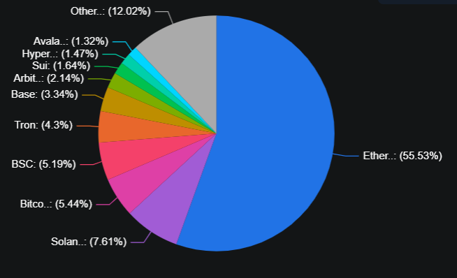 Ethereum’s base layer holds a total locked value (TVL) of $66.6 billion, significantly outpacing rival networks. Ethereum commands 61% market dominance based on TVL, while its closest competitors hold only 14% combined.