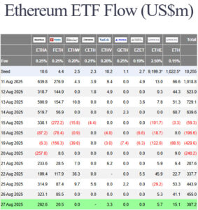 The cryptocurrency markets continue to attract strong interest from institutional investors. According to data released yesterday, Spot Ethereum ETFs recorded inflows of $307.2 million, drawing significant attention. This figure stands out as one of the clearest indicators of the growing institutional appetite for Ethereum in recent weeks.