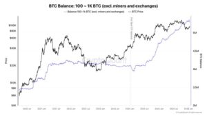 According to Ki Young Ju, U.S.-based institutional wallets, each holding between 100 and 1,000 BTC, have shown particularly significant accumulation. Miners and crypto exchanges are not included in this group, while institutional ETF purchases are included in the calculation.