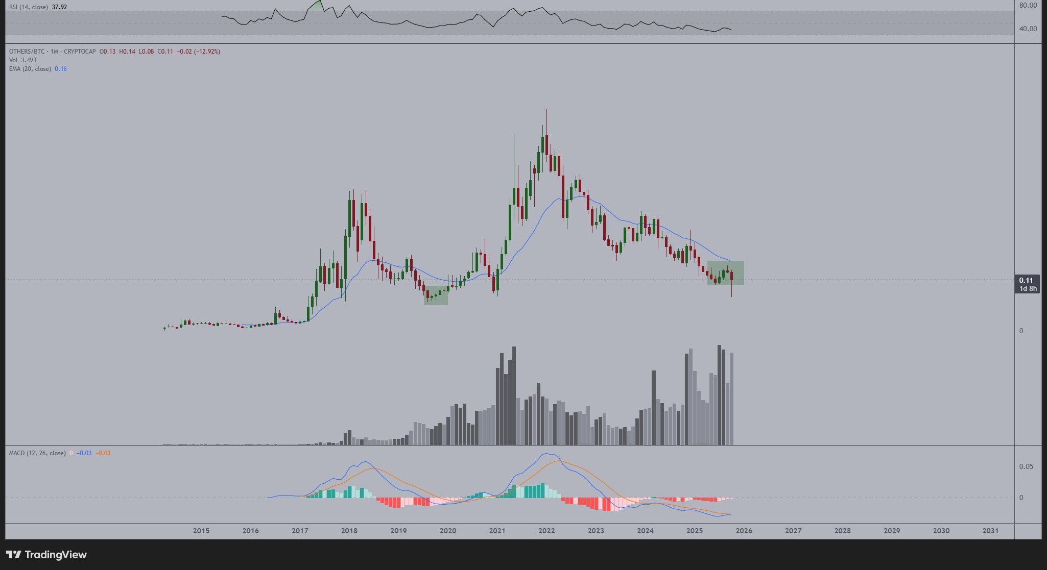 Macro analyst and MN Fund founder Michaël van de Poppe describes the OTHERS/BTC chart as “one of the most valuable indicators in the current market.” He argues that altcoins are now trading at valuations similar to previous market bottoms — notably those seen in late 2016 and early 2020.