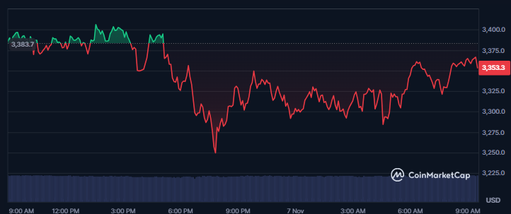ETH has fallen more than 13% over the past week, briefly touching 3,099 dollars on Tuesday before rebounding toward 3,353 dollars at the time of writing. This sharp correction is viewed by some traders as a potential “bear trap,” suggesting downward pressure may be misleading before a possible reversal.