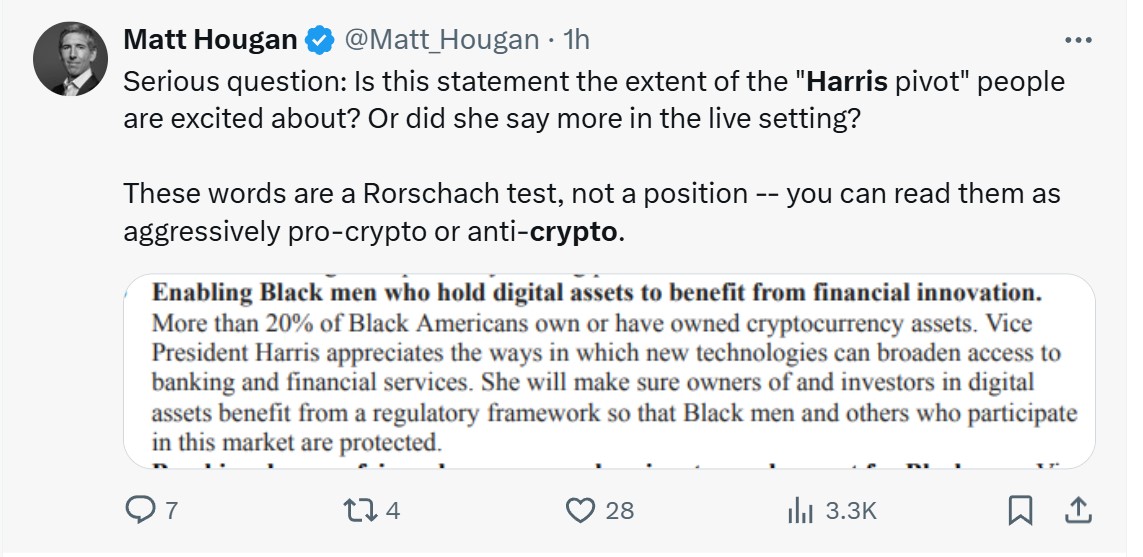 However, not everyone associated with the Harris campaign is positive about this “crypto opening.” Some community members are skeptical of Harris’ moves toward crypto, with the phrase “protecting cryptocurrency ownership” in her campaign documents standing out. Harris is promising to create a regulatory framework that aims to protect crypto owners and provide security for their assets.