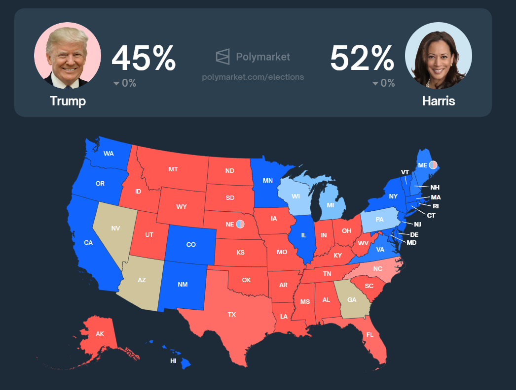 On Polymarket today, Harris’s chances of winning the November election grew to 52%; Trump’s chances of being elected decreased to 46% from 70% in mid-July. On Saturday, Harris turned Trump’s chances of winning upside down.