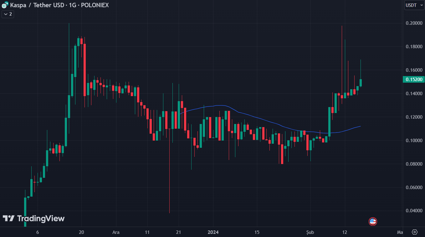 KAS Coin almost doubled its price in just 2 weeks. Its been rising since February 1st and continues its journey. According to TradingView data its currently trading at $0.15 and up more than 10%.