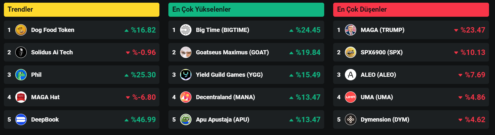 When we look at trending cryptocurrencies, the first thing that stands out is Dog Food Token with an increase of over 16 percent. Among the biggest risers, Big Time is in first place with an increase of over 24 percent, while MAGA is among the biggest fallers.