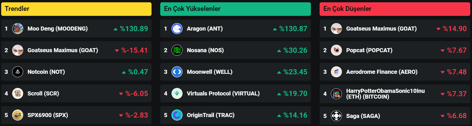 Moo Deng (MOODENG), Goastseus Maximus (GOAT) and Notcoin are among the most trending coins in the crypto market in the last 24 hours. Aragon (ANT), Nosana (Nos) and Moonwell (WELL) are at the forefront of the biggest risers. Goatseus Maximus (GOAT), Popcat (POPCAT) and Aerodrome Finance (AERO) are on the list of biggest fallers in the market.
