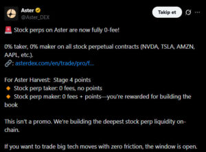 Aster’s removal of all trading fees for stock perpetual products provides a huge cost advantage and makes the platform significantly more appealing. The 0% commission structure offers major opportunities for both active traders and liquidity providers, while additional rewards further strengthen platform activity.