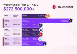 Between October 27 and November 2, several altcoin projects will unlock tokens worth more than $272.5 million in total. This influx could boost liquidity while also triggering short-term volatility.