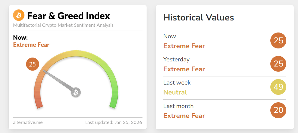 The broader crypto market shows a similar pattern. The Crypto Fear & Greed Index has fallen to 25, firmly within the “Extreme Fear” zone. According to Santiment, the market has entered a clear phase of uncertainty, marked by fading retail interest.