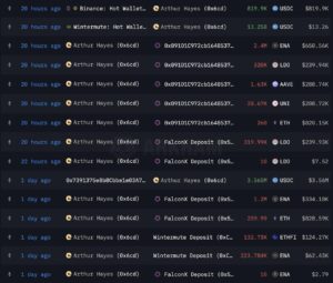 On-chain tracking tools confirm that Hayes transferred the following amounts to FalconX and Wintermute within the last 24 hours: