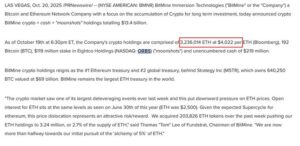 BitMine Immersion Technologies (NYSE: BMNR) announced that it purchased approximately 203,800 Ethereum (ETH) last week. With this acquisition, the company’s total crypto and cash holdings have risen to $1.34 billion.