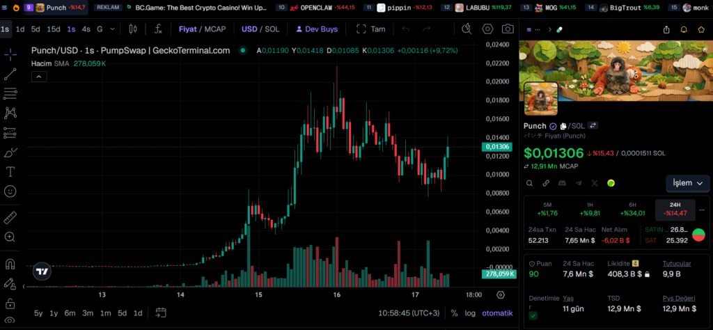 Short-term explosions in crypto rarely go unnoticed — and this time, $PUNCH landed squarely on social media’s radar. Trading on the Solana blockchain, this meme coin delivered eye-catching gains for small investors within just a few days. According to claims circulating online, one investor spent only $290 and reportedly turned it into as much as $80,000 in two days. Market commentators describe moves like this as “community- and hype-driven flash profits.”