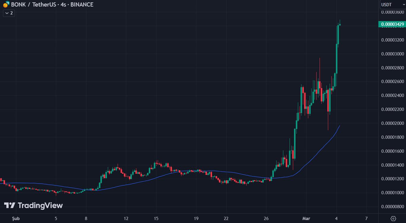 Last week Bonk price doubled itself according to CoinMarketCap’s data. But today BONK is up nearly 58 percent. And trading at $0.000003429.