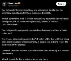 Although USDE losing its peg created a stir in the stablecoin market, the Ethena ecosystem continues to emphasize the system’s security. The protocol reassures users that their assets are not at risk and will provide regular updates on developments.