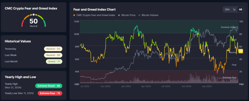 The Crypto Fear and Greed Index, which gauges investor sentiment, stands at 50. This level suggests a market dominated by “greed,” reinforcing belief in the bullish trend of digital assets.