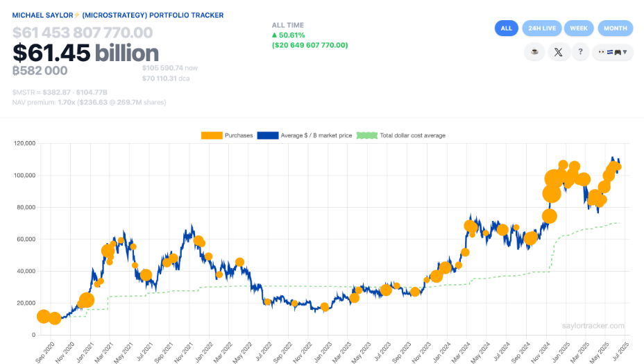 With the latest purchase on June 9, the firm acquired 1,045 BTC worth $110 million. This brings the total BTC holdings to 582,000. According to SaylorTracker data, the company has an unrealized capital gain exceeding 50%. This translates to a potential profit of approximately $20 billion.