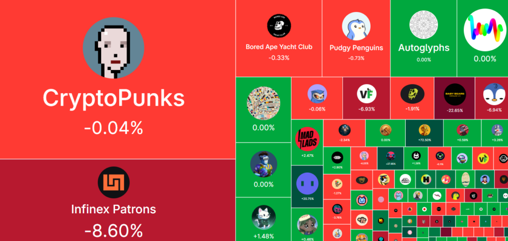 Top NFT collections were not immune. CoinGecko data shows CryptoPunks, Bored Ape Yacht Club, and Pudgy Penguins experienced floor price drops of 12–28% over 30 days, indicating weakening demand even for well-established projects.