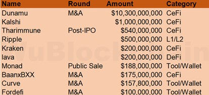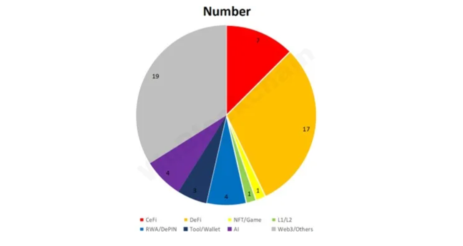 Investments were unevenly distributed across sectors. DeFi led with 30.4% of deals, followed by CeFi at 12.5%, RWA/DePIN and AI at 7.1% each, Tool/Wallet at 5.4%, and NFT/GameFi and L1/L2 at 1.8% each. This distribution indicates strong growth in financial infrastructure and AI-related projects.