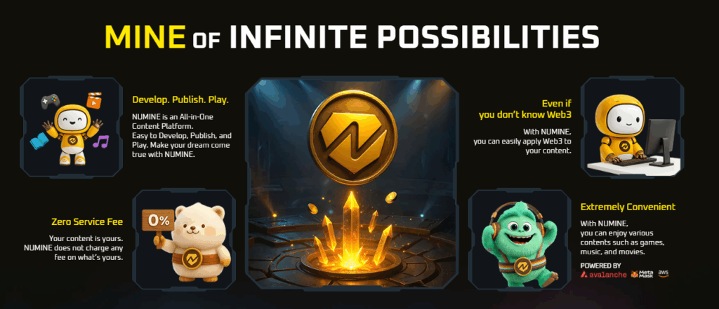 NUMINE aims to simplify the development, distribution, and play of games, music, films, and other cultural content. It helps new users join the Web 3.0 ecosystem, share content experiences, and contribute economically within the tokenomic system.