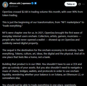 Finzer emphasized that OpenSea is no longer just an NFT marketplace, but is evolving into an “all-in-one trading platform” where every on-chain asset can be bought and sold. According to the CEO, this transformation will allow users to manage all their transactions from a single on-chain hub — without relying on centralized exchanges (CEXs).
