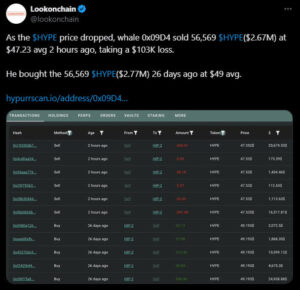 - Whale 0x09D4 sold around 56,569 HYPE tokens at $47.23, taking a loss of $103,000. This whale had purchased the tokens at $49 but decided to sell, anticipating a further decline. The move added additional selling pressure on HYPE.