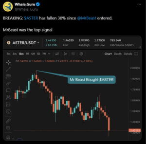 The turbulence in the crypto market hasn’t been limited to anonymous whales. World-famous YouTuber MrBeast faced disappointment shortly after supporting the Binance-linked decentralized exchange Aster (ASTER).