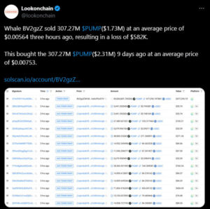 - Whale BV2gzZ dumped 307.27 million PUMP tokens just a few days after buying them. The tokens were sold at an average price of $0.00564, leaving the whale with a $582,000 loss. This once again highlights how extremely risky and volatile meme coins can be.
