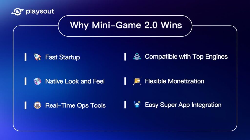 PlaysOut is an open platform aiming to become the “Steam of mini-games.” It hosts games on its own servers and delivers them to users via a WebSocket-based mini-program infrastructure. This allows games to launch quickly on mobile devices without going to an app store. Since only necessary data packets are downloaded, loading times are reduced. For developers, the PlaysOut SDK automates tasks such as resource management, asset packaging, and session tracking. It enables the production of Android, iOS, and HTML5 versions from a single codebase, offering near-native app performance and fluidity.