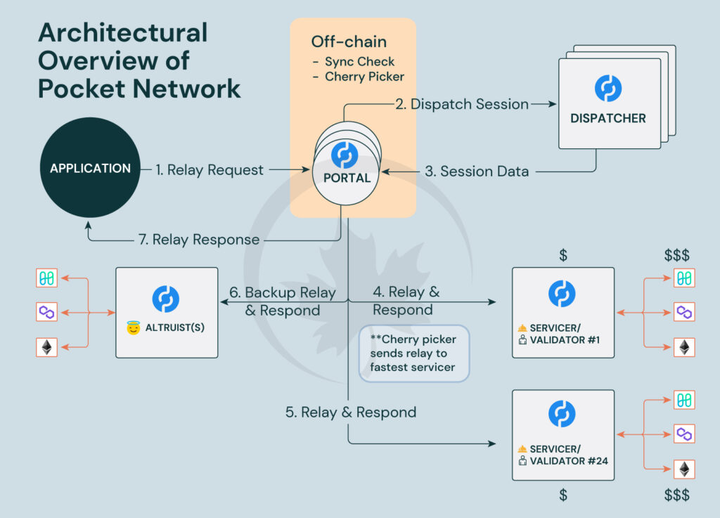 The POKT protocol operates by incentivizing and coordinating a decentralized network of node operators to provide blockchain RPCs (Remote Procedure Calls). This allows applications to interact with over 50 different blockchains and Layer-2 networks. Each data request (relay) is directed to the most suitable nodes by Dispatcher nodes, with the fastest and most reliable node responding, ensuring fault-tolerant and efficient network performance.