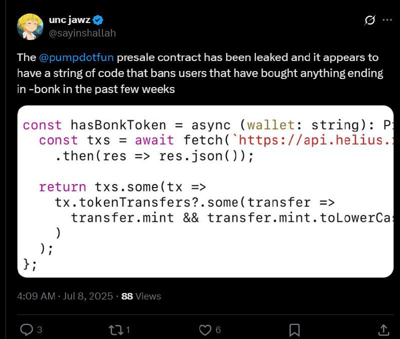 The leaked code from Pump.fun’s presale contract has caused a stir in the crypto world. Shared details show that users who purchased tokens ending with ‘-bonk’ in recent weeks were banned from the presale. This restriction reveals a notable strategy in how the project selects its investors. The leaked line of code — tx.tokenTransfers?.some(transfer => transfer.mint && transfer.mint.toLowerCase().endsWith(‘bonk’)) — technically explains this filtering method.