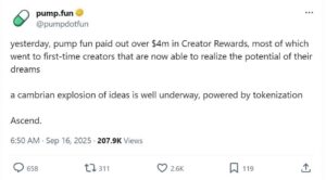 Pump.fun is expanding not only in trading volume but also within the content creator ecosystem. On Monday, the platform announced that $4 million was paid out to content creators, with the majority of these rewards going to first-time creators.