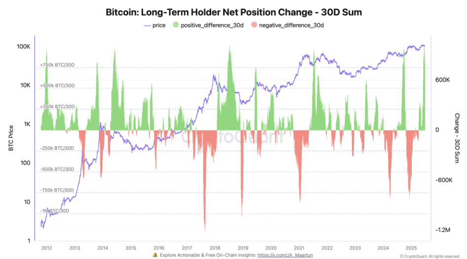According to CryptoQuant data, the supply of long-term Bitcoin holders has surged by 800,000 BTC in the past 30 days, reaching a record high. Historically, such increases have occurred just before major price rallies.