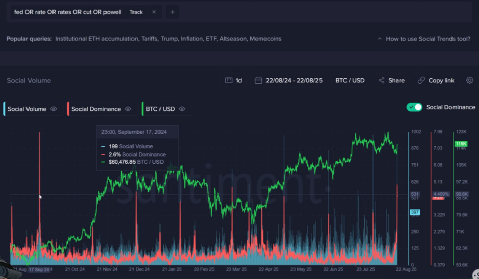 The crypto market has turned its focus to the U.S. Federal Reserve’s September rate decision. Mentions of the Fed and rate cut keywords on social media have surged to an 11-month high. According to Santiment, this trend may signal a potential warning for the market.