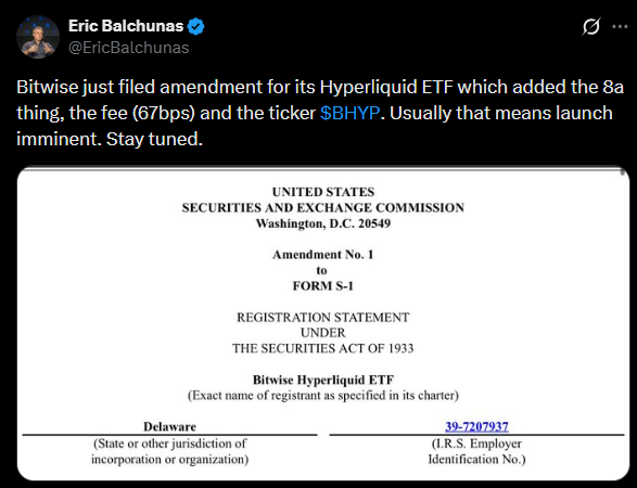 Asset management firm Bitwise has taken a notable step forward in its Hyperliquid-related ETF initiative. The latest amendment to the filing includes the addition of an 8-A registration, the disclosure of a 67 basis point annual management fee, and confirmation that the product will trade under the ticker symbol $BHYP.