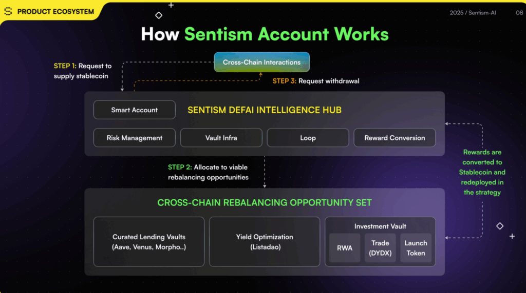 • Sentism Account: Manage all DeFi actions from a modular smart wallet.