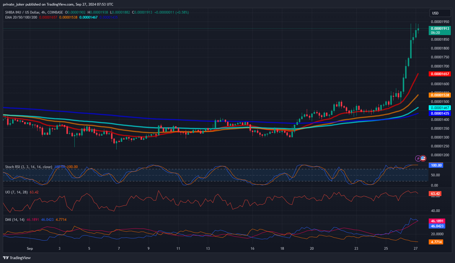 - Stochastic RSI (14): This indicator shows a value of 100, signaling an overbought condition. While this suggests some caution, it also reflects strong demand for SHIB in the current market.