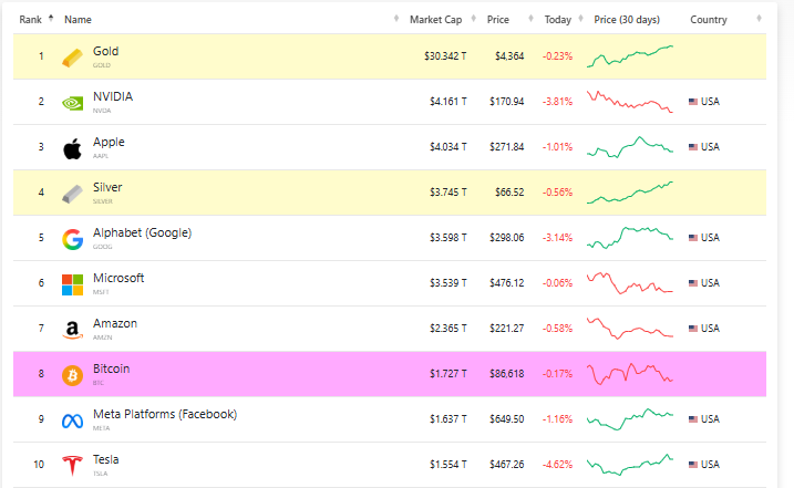 Bitcoin continues to rank among the world’s largest assets, holding eighth place with a market capitalization of about $1.73 trillion. Trading near $86,618, Bitcoin still trails traditional stores of value such as gold and silver by a wide margin. Meta and Tesla follow closely behind in the global rankings.
