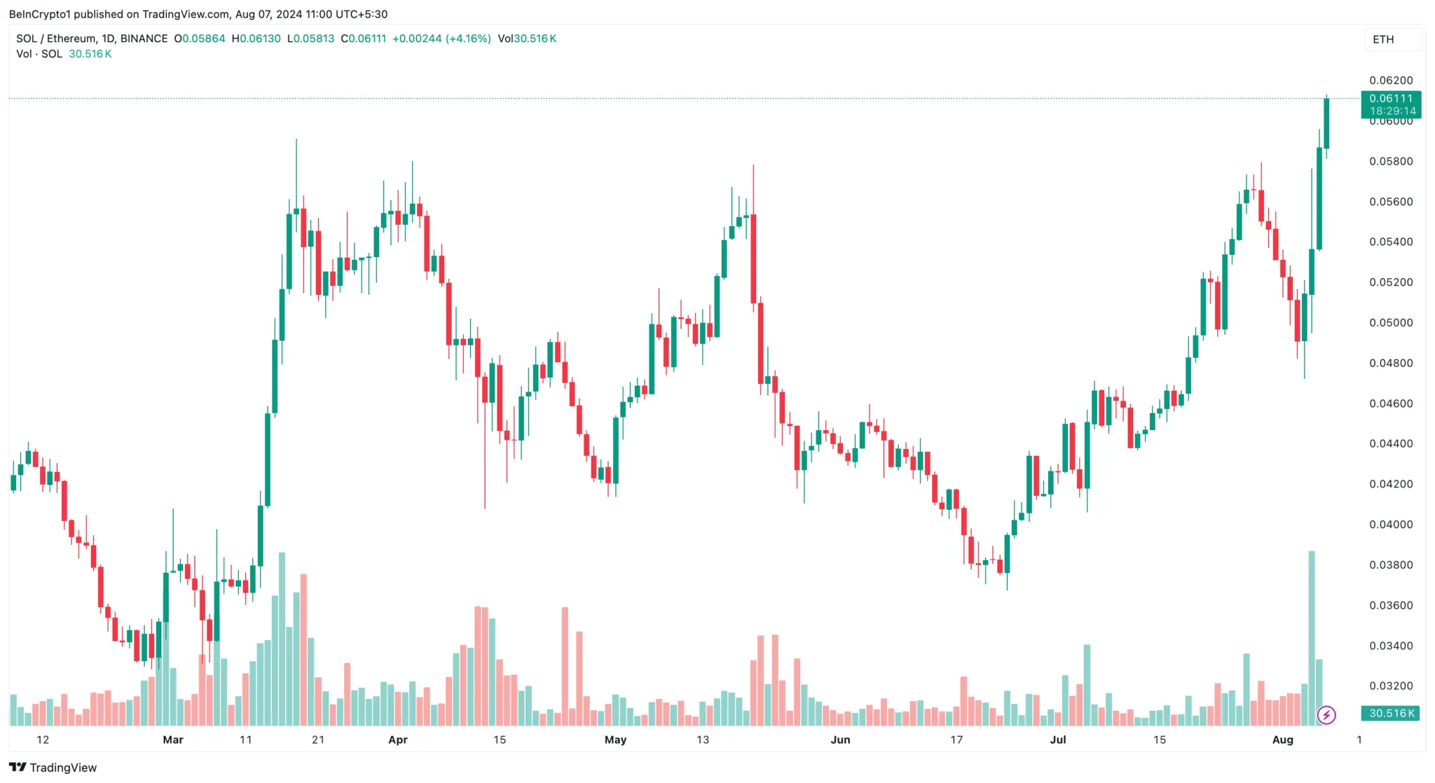According to TradingView data, the Solana to Ether ratio peaked on Aug. 6 at 0.0595.