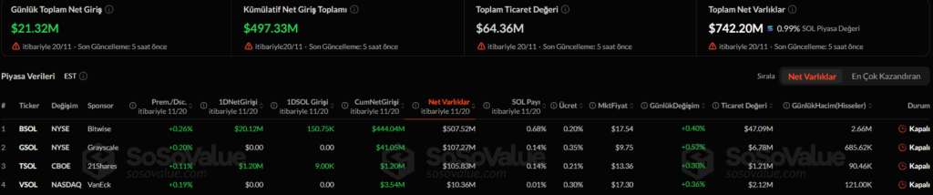 The ETF data from November 20 shows Solana standing out with strong inflows, while Bitcoin and Ethereum came under heavy selling pressure. Additionally, investor interest appears to be shifting toward alternative blockchain assets, hinting at a new potential trend in the crypto ETF market. On the other hand, the acceleration of institutional activity suggests that ETF flows will play an even more decisive role in the coming days.