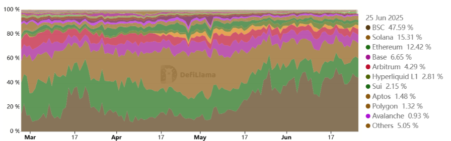 Leading protocols included Raydium ($19.1B), Pump.fun ($14.2B), and Orca ($13.9B). BNB Chain maintained its top position with $159.6 billion volume, while Solana rose to second place by increasing its market share throughout June. Despite this rise, overall network activity remained 91% lower compared to January.