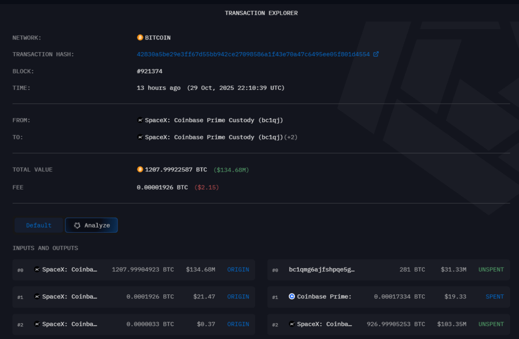 Over 1,207 BTC were moved from SpaceX wallet. Unspent 281 BTC were sent to the ‘bc1qmg’ account, while 19.33 BTC were directed to Coinbase Prime. The remaining 927 BTC returned to SpaceX’s wallet.