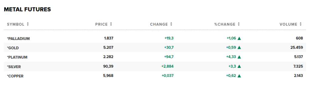 Platinum: $2,282.9, +95.6 (+4.37%), volume: 4,974