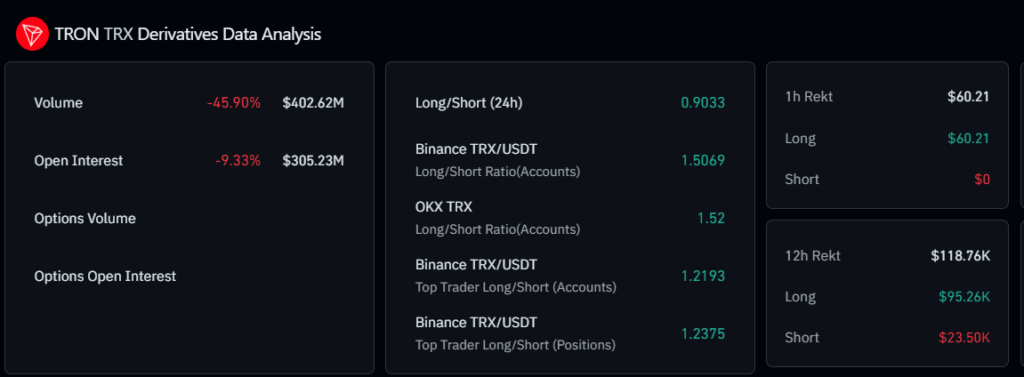 In TRX derivatives, open interest increased by 8.25% over the past 24 hours to $329 million. The weighted funding rate reached 0.0098%. This indicates bullish positions dominate. Meanwhile, short positions were liquidated during the day, and long positions were preserved nearly twice as much. This suggests weakening bearish sentiment in the market.