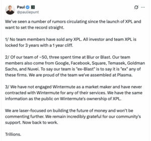 Plasma founder Paulie Punt issued a public statement to restore investor confidence amid recent market speculation. Punt addressed claims regarding token sales and team composition, providing the following clarifications: