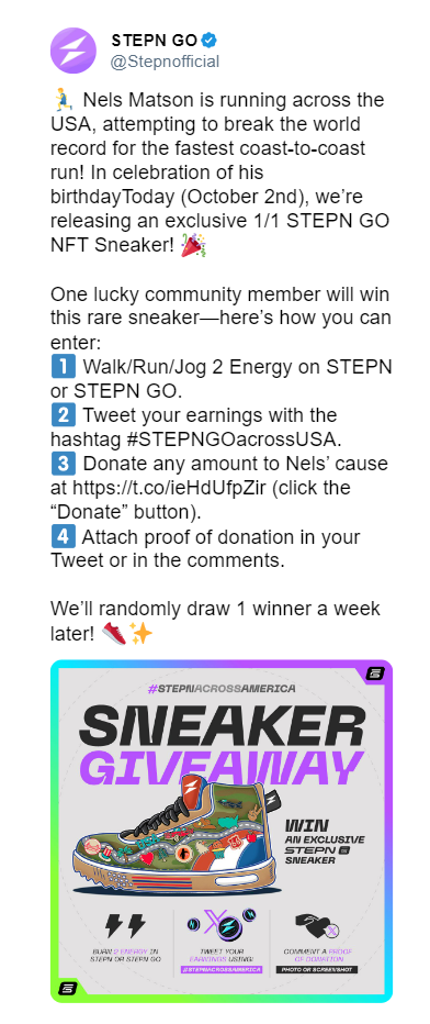 The announcement coincides with Nels Matson’s birthday on October 2nd, as shared in a tweet by GMT, STEPN’s governance token. The tweet read: “Nels Matson is running across the USA, attempting to break the world record for the fastest coast-to-coast run! In celebration of his birthdayToday (October 2nd), we’re releasing an exclusive 1/1 STEPN GO NFT Sneaker!”
