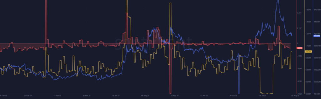 On the other hand, open interest dropped to $699.6 million, revealing waning speculative interest. Additionally, the weighted market sentiment has declined to -0.655. Conversely, the social engagement rate rose to 0.973%. These conflicting metrics create uncertainty over short-term direction.