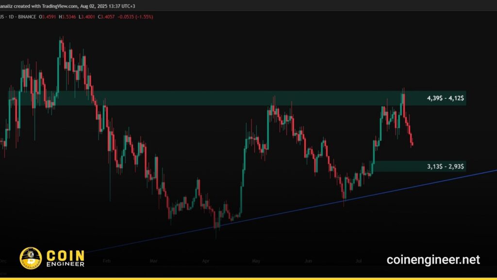 Currently, the price is hovering near a lower support range of $3.13 – $2.93. This zone is also in close proximity to the ascending trendline and will likely be a critical level to monitor. A strong reaction from this area could pave the way for a renewed bullish push.