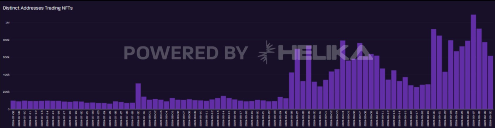 According to Helika’s Web3 Gaming Report, the number of unique NFT wallets on Telegram in Q3 2024 has increased from less than 200,000 in July to more than one million in September.